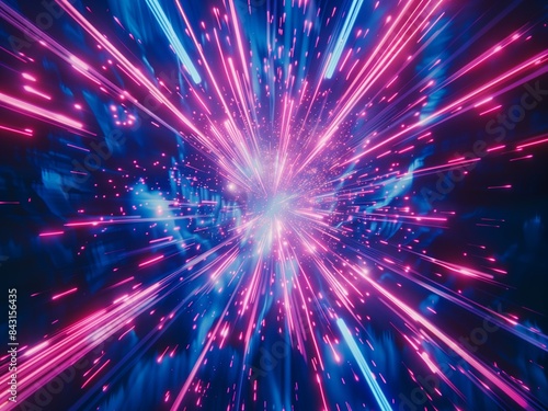 A dynamic explosion of blue and pink light streaks radiating from a central point against a dark background