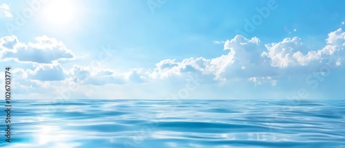 A expansive water body beneath a blue sky Sun illuminates, filtering through clouds overhead, casting light upon water's surface