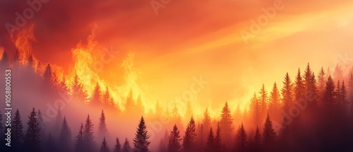 A forest teeming with tall trees beneath an orange-yellow skied canopy, where trees emit smoky hues from their tops