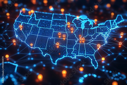 A high-tech, illuminated 3D map of the United States, showcasing various pinpoint locations across the country. The map is vibrant with blue lights highlighting the states' boundaries