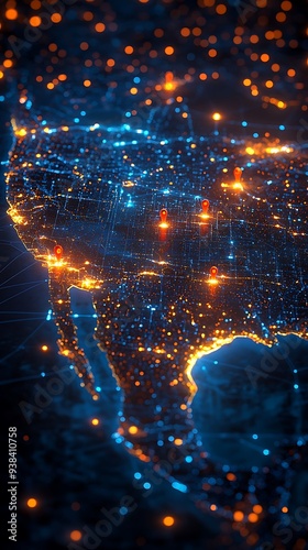 A high-tech, illuminated 3D map of the United States, showcasing various pinpoint locations across the country. The map is vibrant with blue lights highlighting the states' boundaries