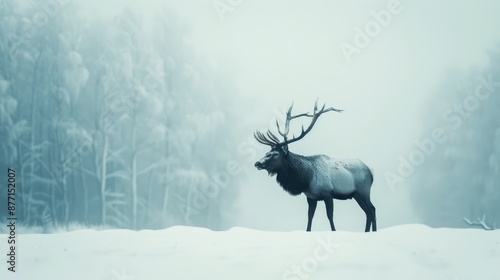 A large elk stands in a snow-covered field, surrounded by tall trees against a foggy backdrop