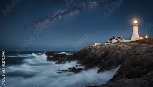 A lighthouse on a rocky island shines its bright beam on a clear, starry night.
