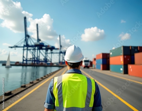 A man wearing a yellow vest stands near a large body of water. He is looking out at the ocean with several cargo ships in the distance, including one with a red crane on it. The sky is clear and blue
