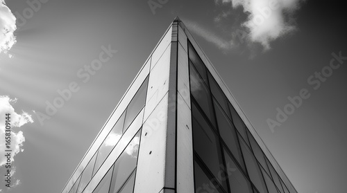 a modern building's corner, showing the sharp edge of the glass and concrete structure