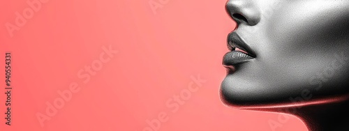 A monochrome woman's face against a red backdrop, overlapped by another identical black-and-white woman's portrait