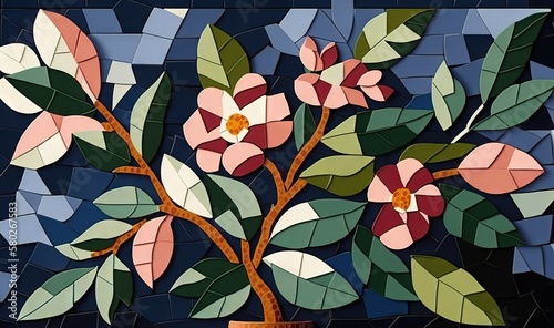 a painting of a vase with flowers on a mosaic wallpapered background with a blue sky in the back ground and a blue sky in the background. generative ai