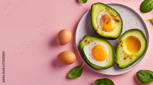 A plate of eggs and avocados on a pink surface with green leaves and eggs centered on it