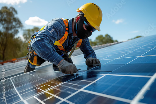 A profesional engaged in the installation of solar panels on a rooftop. He is dressed in appropriate safety workwear, , highlighting the importance of safety in such tasks.