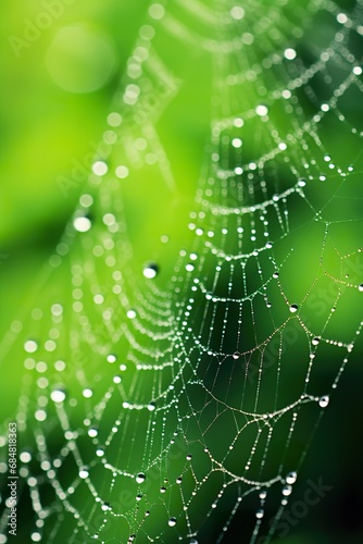 a rare, dew-covered spider web in the early morning light, showcasing the intricate patterns and water droplets with a blurred green natural background
