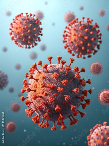 A realistic 3D illustration of coronavirus particles in microscopic detail, showing their structure with spike proteins. A scientific visualization for medical and educational use.