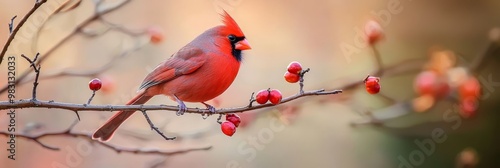 A red bird perched atop a tree branch, adjacent to another laden with red berries