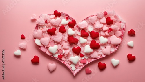 A romantic paper of red hearts, delicately placed on a pastel pink table. The top view captures the intricate details of this beautiful composition, perfect for a Valentine's Day greeting card