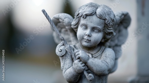 A small angel statue holds a hat and wields a stick in one hand, while cane is in the other