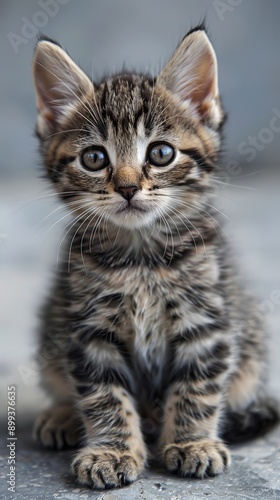 A small kitten sits on the ground, gazing at the camera with sadness in its eyes