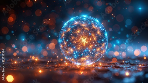 A sphere on a dark background with a star inside and bokeh lighting surrounding it