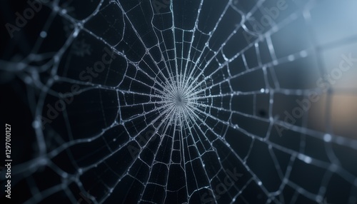 A spiderweb with dewdrops reflecting the light against a dark background creating a beautiful pattern
