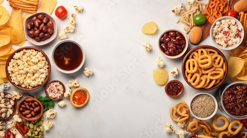 a table topped with bowls of snacks and snacks on top of it. generative ai