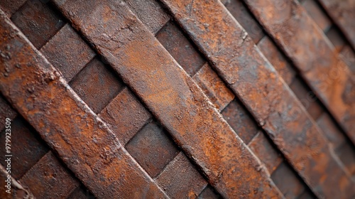 A tight shot of a brick wall featuring a rusted metallic framework centered within, accompanied by a horizontal rusted metal band in its midsection
