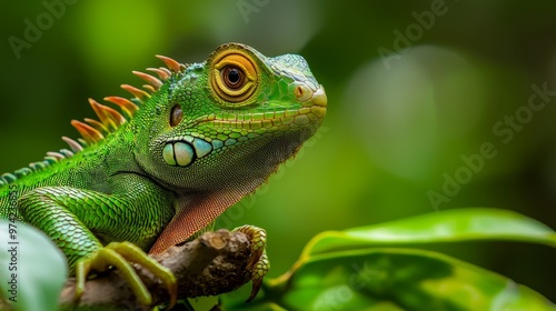 A tight shot of a green iguana perched on a branch, adorned with leaves in the near proximity The background is softly blurred