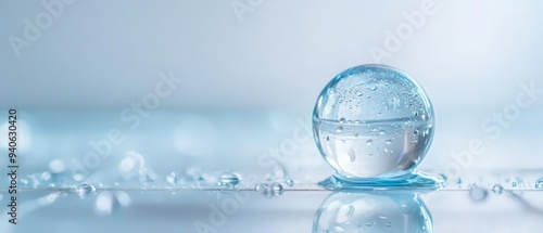 A tight shot of a water droplet atop a surface, displaying underside drops