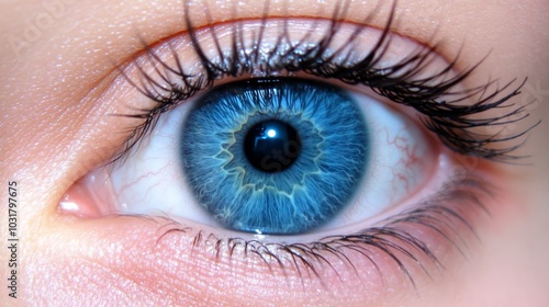 A tight shot of an eye, revealing a blue eyeball at its iris core