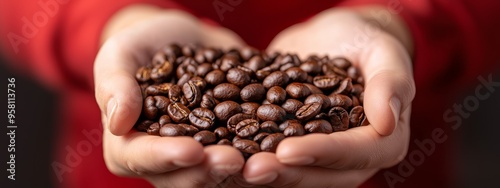 A tight shot of hands holding coffee beans, beans nestled in palms