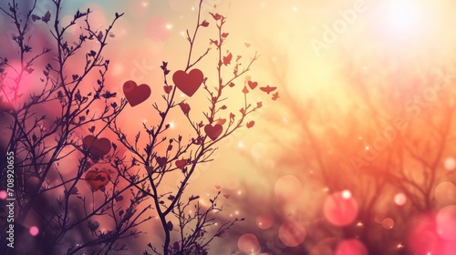 a tree with hearts hanging from it's branches in front of a blurry background of pink, blue, yellow, and green leaves in the foreground.
