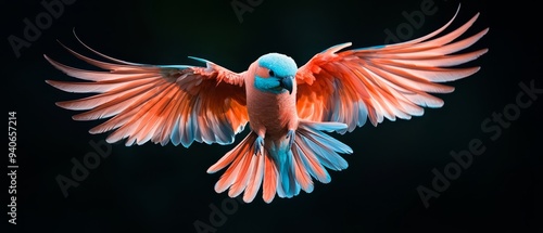 A vibrant bird flaps wide-spread wings against a backdrop of black