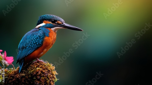 A vibrant bird sits atop a moss-laden tree branch, near a bush bursting with pink and green blossoms Background softly blurred