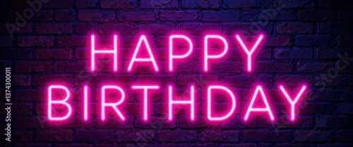A Vibrant Birthday Message in Glowing Neon Letters Against a Dark Brick Wall