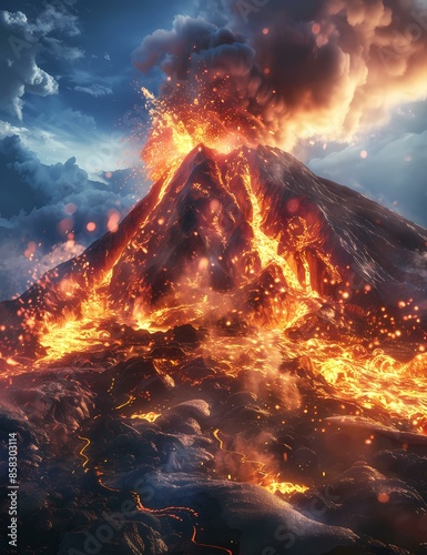 a volcanic eruption with molten lava flowing down the sides, set against a dramatic cloudy sky. 8.5*11 ratio