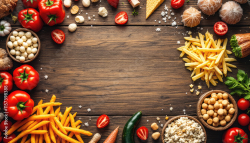 A wooden table displays an array of fresh produce, including tomatoes, potatoes, chickpeas, carrots, and cheese, arranged in a visually appealing manner.