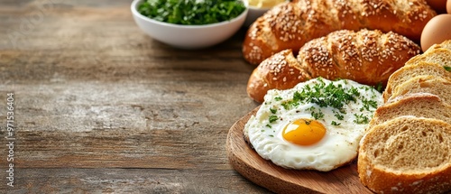 A wooden table holds a plate with bread, eggs, and further food items Nearby, a separate bowl contains eggs