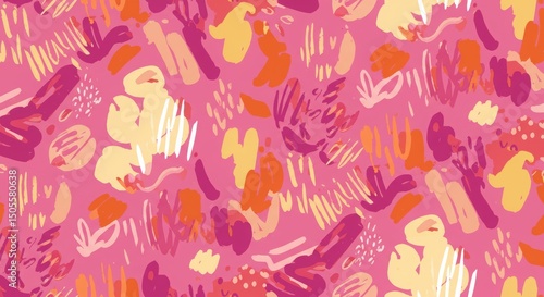 abstract pattern featuring various brushstrokes and organic shapes in a warm color palette. pink, yellow, orange, and darker pink,magenta