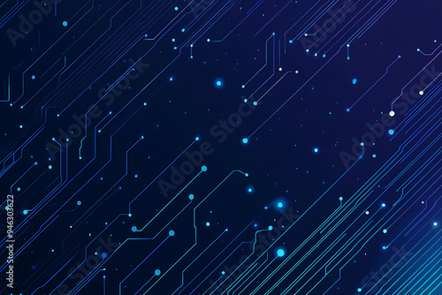 Abstract representation of a circuit board with glowing neon lines and geometric patterns against a dark background. The image evokes a high-tech, futuristic feel with ample copy space