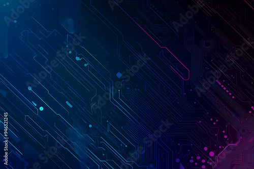 Abstract representation of a circuit board with glowing neon lines and geometric patterns against a dark background. The image evokes a high-tech, futuristic feel with ample copy space