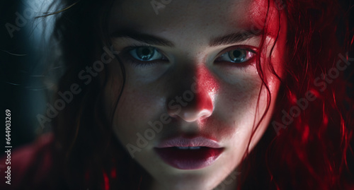 Ai-generated Intense close-up Halloween portrait of a woman. Her wide-open eyes are conveying a profound sense of fear. The pupils dilated showing the depth of her angst of the true Halloween spirit.