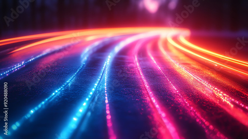 An abstract design with a curved path of glowing blue, pink, and orange lines.