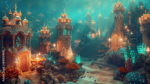 : An underwater kingdom with coral towers and pearl gates, illuminated by bioluminescent flora and fauna, casting a surreal glow on the fantastical marine architecture.