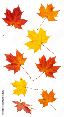 ** Autumn Maple Leaves: Vibrant Fall Foliage on White. Red, Yellow, & Orange Colors of Nature's Seasonal Change.