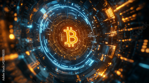 Bitcoin Logo in Digital Tunnel, Futuristic Blockchain Technology