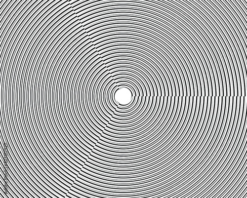 Black halftone dots in vortex form. Geometric art. Trendy design element.Circular and radial lines volute, helix.Segmented circle with rotation.Radiating arc lines.Cochlear