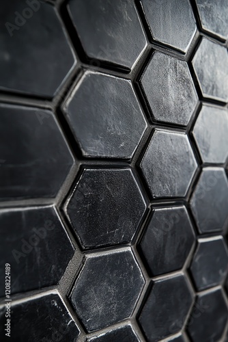 Black hexagonal tiles forming geometric pattern with textured surfaces. Sleek and modern design showcases bold architecture, industrial style, and creative interior inspiration.