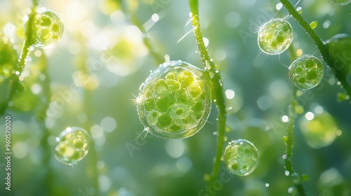Bright green bubbles of algae floating in water, illuminated by sunlight, showcasing the beauty of aquatic life and natural ecosystems.