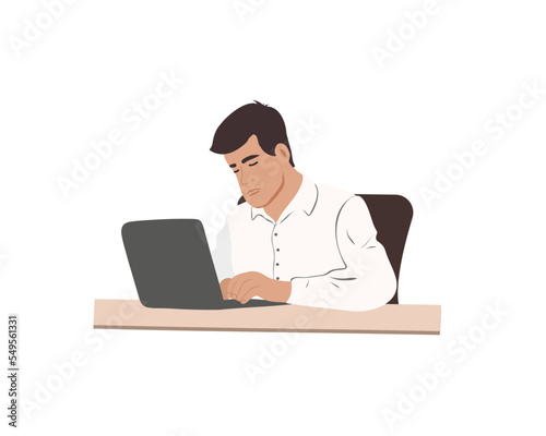 business man sits at a table with a laptop and reads a document at the table, looks through documents, pays bills and reads a letter. Flat vector illustration.