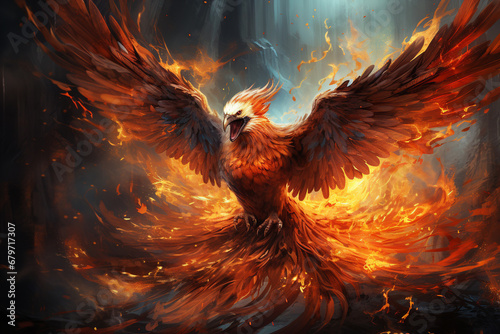 Captivating visual representation of the mythical phoenix, a symbol of rebirth and renewal, engulfed in mesmerizing flames. Ai generated