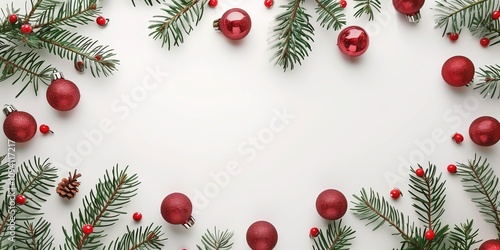 Christmas Fir Branches with Red Baubles and Copy Space