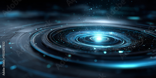 Circular holographic panels orbiting a glowing tech core with pulsing data.