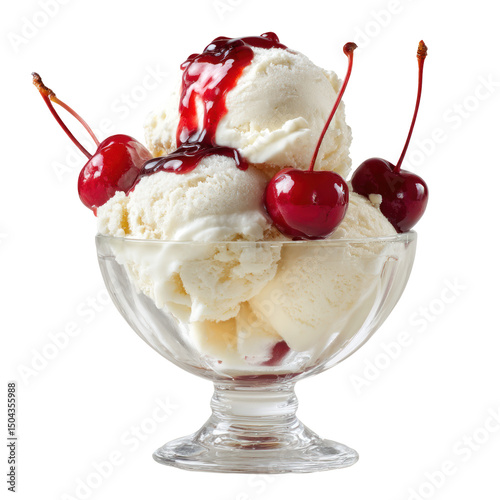 Classic Vanilla Ice Cream Topped with Cherry and Syrup on Transparent Background